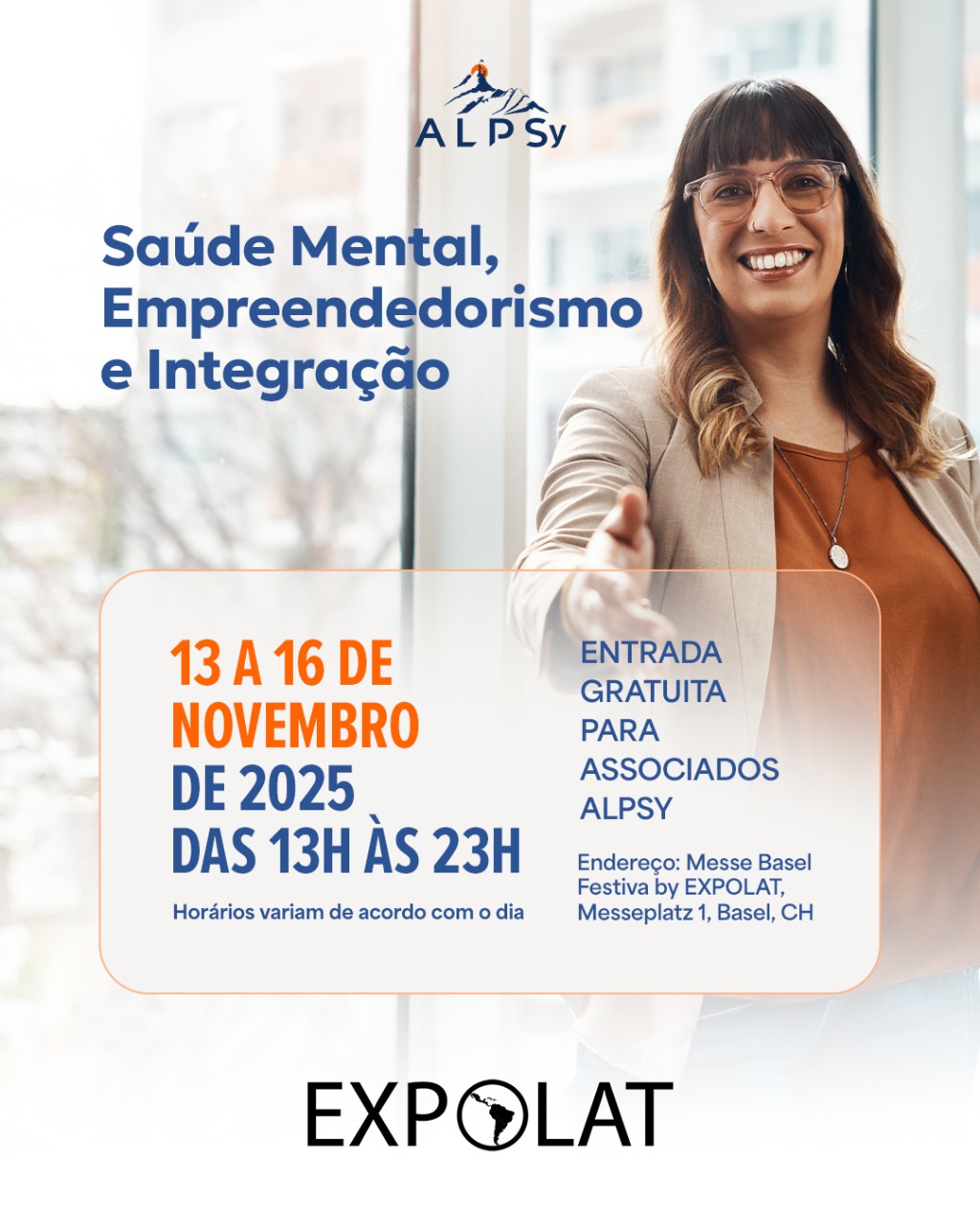 🌎 ALPSY na EXPOLAT 2025! ✨ 🪢Saúde Mental, Empreendedorismo e Integração✅ Do dia 13 a 16 de Novembro de 2025, a ALPSY estará presente na Festiva Basel by EXPOLAT, o maior evento Suíço voltado para América Latina! Venha conhecer nosso trabalho e como podemos inspirar empreendedores com conversas estratégicas sobre carreira, empreendedorismo e saúde mental em contexto migratório. Temas essenciais para integração profissional no país onde se vive. 🔎 Essa é uma ótima oportunidade para se conectar com a Comunidade e Empreendedores, se integrar, conhecer artistas e profissionais de toda a América Latina, além de aproveitar de uma gastronomia gostosa e diversificada. 🗓 Data: 13 a 16 de Novembro 2025 ( Festa Brasileira dia Sábado dia 15 com muita música) 🕐 Horário: das 13h às 23h (variável conforme o dia) 📍 Local: Messe Basel – Festiva by EXPOLAT, Messeplatz 1, Basel. 💙 A ALPSY É FEITA POR VOCÊS E PARA VOCÊ🧡